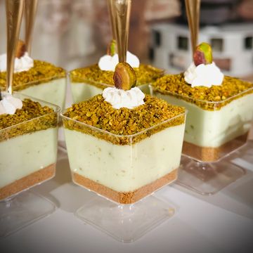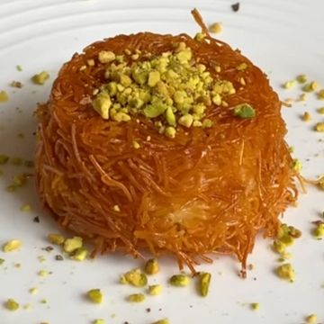 Buttered phyllo dough shredded and stuffed with sweet cheese, topped with syrup and pistachios