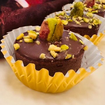 Chocolate tart filled with a crunchy mixture of pistachio cream and shredded filo dough. Topped with a chocolate cream and pistachios