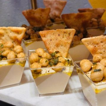 Fresh Garlic Hummus Dip, Sprinkled with Zat'ar and topped with Chick Peas, and Pita Chips.