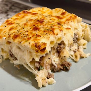 Penne pasta tossed in a creamy béchamel sauce, layered with ground beef and topped with mozzarella cheese