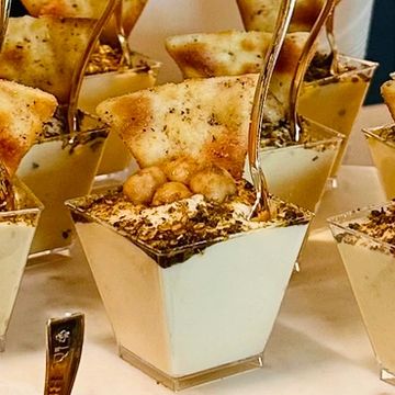Fresh Garlic Hummus Dip topped with Chick Peas, Sprinkled with Zat'ar with Pita Chips