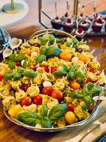Tortellini pasta skewered with cherry tomatoes and fresh mozzarella, Seasoned with a basil pesto sauce