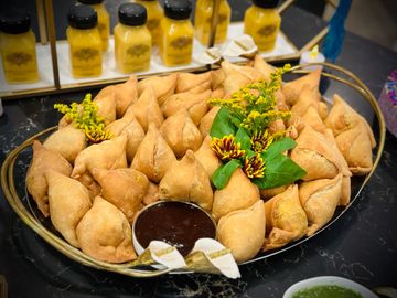 Puff Pastry stuffed with Potatoes, Green Peas, and Indian Spices. Served with a side of Chutney